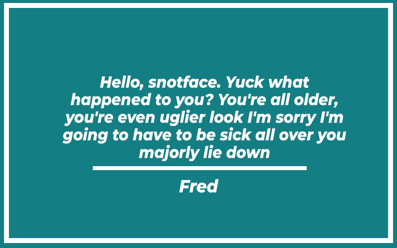 “Hello, snotface. Yuck what happened to you? You’re all older, you’re even uglier look I’m sorry I’m going to have to be sick all over you majorly lie down.” – Fred